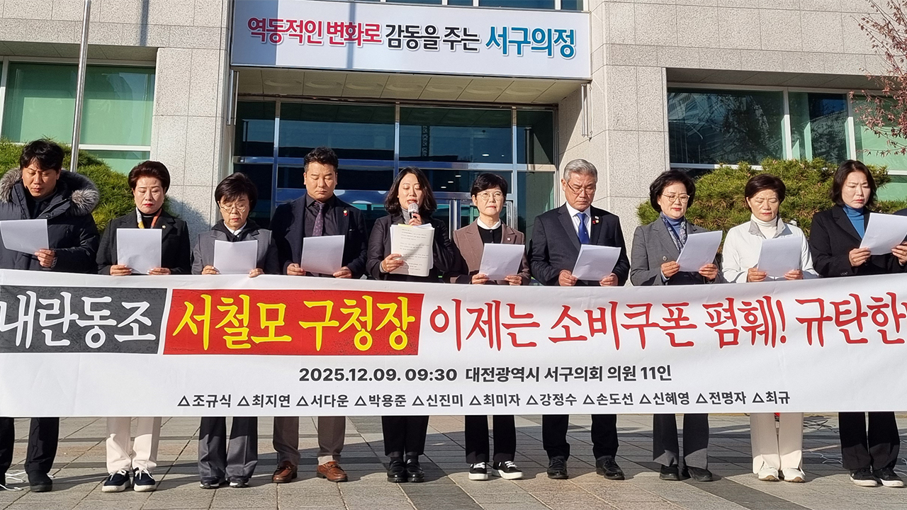 #9650; 대전 서구의회 의원들대전 서구의회가 국민의힘 소속 서철모 서구청장의 소비쿠폰 정책 저격 발언과 관련해 #34;주민을 호도하고 있…