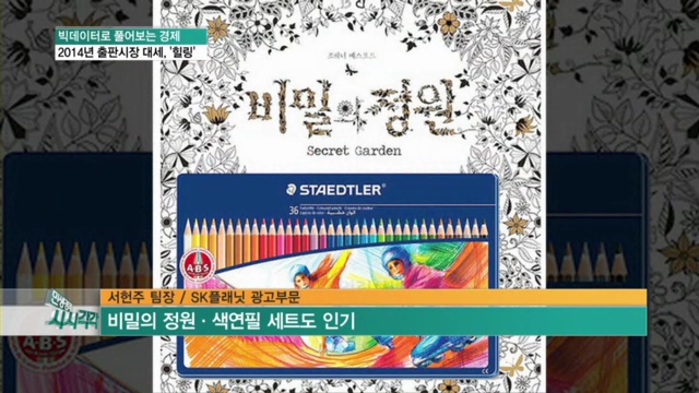 ■ 김선경의 민생경제 시시각각 &<앵커&> 책은 &'마음의 양식&'이라고 하죠? 새해부터 독서로 마음의 곳간을 넉넉하게 채우겠다고 다짐했던 분들 많으실텐데요, 계획대로 잘하고 계십니까? 서점가의 베스트셀러를 보면, 트렌드를 읽을 수 있는데요. 지난해엔 세월호 사태 등 우울한 소식이 많았기 때문일까요? 요즘 출판시장은 &'힐링서적&'이 대세로 떠올랐다고 합니다. 빅데이터로 2014년 출판시장을 좀 들여다보죠, 빅데이터 읽어주는 남자분이시죠! 줄여서 데타남! & 서헌주 팀장, 전화 연결합니다. 서 팀장님, 안녕하세요? 요즘 워낙 미디어도 많아서 책 출판에 대한 관심이 예전만 못할것 같은데 지난 한 해 동안 소셜상에서 &'출판&'에 대한 관심은 어느 정도였나요? &<서헌주 팀장 / SK플래닛 광고부분&> 2014년 1월1일부터 12월 31일까지 &'책&'과 관련된 소셜버즈 180만건을 분석했는데요, 월평균 버즈량이 약 15만건으로 나타났습니다. 대중적인 &'영화&'에 대한 소셜분석 버즈량이 월평균 15만 5천여건으로 나타난 것과 비슷한 수준이었는데요. 이걸 보면 &'책&'이 문화생활을 책임진 핵심 콘텐츠 산업이란 걸 소셜상에서도 확인할 수 있었습니다. &<앵커&> 반가운 소식인 것 같아요. 그럼, 우리나라 사람들의 책에 대한 생각은 어떤지 궁금한데요? &<서헌주 팀장 / SK플래닛 광고부분&> &'책&' 과 관련된 주요 키워드 상위 30개 중, 먼저 &'추천&'이 두드러지는 키워드로 나타났는데요. 책을 고를 때 여전히 입소문이나 전문가의 추천이 중요하다는 걸 알 수 있고요. 다음으로 &'사랑, 세상&'이란 키워드가 상위에 링크된 걸 보면 &'사랑&'과 &'세상&'이 여전히 책의 보편적인 주제로 회자되고 있다는 걸 알 수 있습니다. 마지막으로 흥미로운건 &'공부&'라는 키워드가 언급된점인데요. 아직까지 &'공부하다&'와 &'책을 읽는다&'를 같은 의미로 사용하고 있어, 독서가 여가나 취미생활이 아닌 공부나 학습의 의미가 더 강하게 자리잡고 있다는 걸 알 수 있죠. &<앵커&> 네, 유독 우리나라에서 독서를 공부라고 생각하는 부분이 많은 것 같아요. 이쯤에서 제일 궁금한 게 지난 한 해 동안, 어떤 책들이 독자들의 사랑을 받았을까인데요 어떻습니까? &<서헌주 팀장 / SK플래닛 광고부분&> 교보문고가 집계한 소설,시, 에세이 등 종합 베스트셀러 순위를 보면, 영화나 TV의 영향을 받아 판매가 되는 미디어셀러 현상이 두드러졌는데요. 영화로 만들어진 스웨덴 작가의 &'창문 넘어 도망친 100세 노인&'과 &'겨울왕국&', 그리고 드라마로 제작된 &'미생&'이 대표적입니다. 또, 철학자 강신주의 &'감정수업&', 혜민스님의 &'멈추면 비로소 보이는 것들&', 법륜스님의 &'인생수업&' 같은 자기성찰과 관련된 서적도 인기를 끌었고요. 어른들을 위한 색칠공부 책으로 불리는 &'컬러링북&'인 &'비밀의 정원&'의 선전도 눈에 띕니다. &<앵커&> 그럼, 쇼설 분석을 통해 본 베스트셀러의 인기 비결은 뭔가요? &<서헌주 팀장 / SK플래닛 광고부분&> 네, 베스트셀러 1위를 차지한 &'창문 넘어 도망친 100세 노인&'의 감성 표현어를 분석해 보면, &'재밌다, 유쾌하다, 긍정적이다&'의 비중이 높게 나타납니다. 2014년은 세월호 사태 등 각종 사건, 사고로 얼룩지고, 사회에 대한 불만 등으로 사회 전반에 부정적인 분위기가 퍼지면서 사람들의 심리적인 피로가 누적된 상태였는데요. 이 책이 유머코드와 긍정적인 관점에서 인생 이야기를 재미있게 풀어내서 독자들의 심리적인 피로를 풀어준 점이 인기비결이라고 할 수 있고요. 또, 6월에 영화가 함께 개봉되면서 미디어셀러로서 화제몰이를 한 점도 한몫을 했다고 할 수 있죠. &<앵커&> 그렇군요. 앞서, 베스트셀러 목록에서 &'안티-스트레스 컬러링북, 비밀의 정원&'도 눈길을 끄는데요. 역시 같은 맥락인가요? &<서헌주 팀장 / SK플래닛 광고부분&> 맞습니다. 컬리링북은 어른들을 위한 색칠공부 책인데요. &'비밀의 정원&'으로 대표되는 컬러링북이 안티-스트레스, 힐링 콘셉트로 베스트셀러 반열에 올랐습니다. &'컬러링북&'의 버즈량 월별 추이를 보면 지난해 하반기에 들어서면서부터 관심이 크게 늘어나고 있는 걸 알 수 있죠. 이런 분위기를 반영하듯, 1월 둘째주 예술 부문 베스트셀러 상위 20위에 한권을 제외하고 모든 책이 컬러링북이나 캘리그래피 등 독자가 참여하는 &'Story-doing Book&'이 차지하고 있습니다. &<앵커&> 네, 그래서 그럴까요? 책과 함께 색연필도 불티나게 팔리고 있다고요? &<서헌주 팀장 / SK플래닛 광고부분&> 네, 일부 서점에선 독일 미술용품 업체인 &'파버 카스텔&'의 36색 색연필과 책을 묶어서 판매하고 있는데요. 색연필이 동이 나는 바람에 다른 상품으로 대체하는 해프닝도 있었다고 합니다. &<앵커&> 그야말로 &'컬러링북&'이 대세인데 이렇게 대박이 난 비결이 뭐라고 보십니까? &<서헌주 팀장 / SK플래닛 광고부분&> 소셜분석으로 나타난 &'컬러링북&' 연관 키워드는 &'스트레스&'와 &'힐링&'인데요. 명상 같은 힐링을 넘어 독자가 직접 참여하는능동적인 힐링이 필요할 만큼 사회 전반에 누적된 스트레스를 컬러링북으로 풀려는 독자들이 많기 때문으로 해석할 수 있겠고요, 또 감성 표현어를 분석해 보면, 상위 30개 중 &'예쁘다,