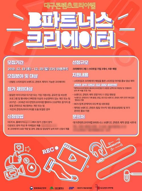 대구디지털산업진흥원(원장 이승협) 대구콘텐츠코리아랩에서는 우수한 서비스 또는 아이템을 보유한 대구지역 스타트업에 크리에이터를 매칭, 아이템에 대한 홍보영상 제작을 지원하여 브랜드 가치를 높이고 시장 진입을 지원하는 &'B파트너스 브랜디드 콘텐츠 제작&' 프로젝트를 운영한다고 밝혔다. &'B파트너스 브랜디드 콘텐츠 제작&' 프로젝트는 사업장이 대구에 소재한 스타트업과 브랜디드 콘텐츠 제작이 가능한 크리에이터를 매칭하여 선발된 기업의 아이템 홍보영상 제작을 지원하는 사업으로, 12월까지 스타트업과 크리에이터를 순차적으로 모집하고 2020년 1월부터 2월까지 운영한다. 12월 19일부터 &'B파트너스 브랜디드 콘텐츠 제작&'에 참가할 크리에이터를 모집하고 있으며, 12월 29일 23시 59분에 모집을 마감한다. 영상 제작능력을 갖추고 있고, 유튜브 채널을 가지고 있는 크리에이터라면 누구나 지원 가능하며, 상품이나 앱 서비스 중 자유 선택하여 콘텐츠 기획안을 작성하여 신청하면 된다. 또한, 타기관 및 기업지원사업, 공모전 등 홍보콘텐츠 제작지원 등이 포함된 프로그램 등에서 동일 콘텐츠 및 목표로 5백만원 이상의 수상경력이 있는 크리에이터는 제외된다. 이번 사업에 선정된 크리에이터는 400만원의 제작지원금(홍보비 포함)을 받으며, 콘텐츠 제작 전문가의 1:1 밀착 멘토링을 받게된다. 대구콘텐츠코리아랩 홈페이지에서 신청서를 다운받아 작성 후 이메일로 접수하면 된다. 최종 선발자는 2020년 1월 2일에 발표될 예정이다. 한편, 동 사업의 스타트업 모집도 같은 기간이 12월 29일 23시 59분까지 이루어지고 있다. 더 자세한 사항은 대구콘텐츠코리아랩 웹테이너 프로젝트 운영 사무국으로 전화 또는 이메일로 문의가 가능하다.